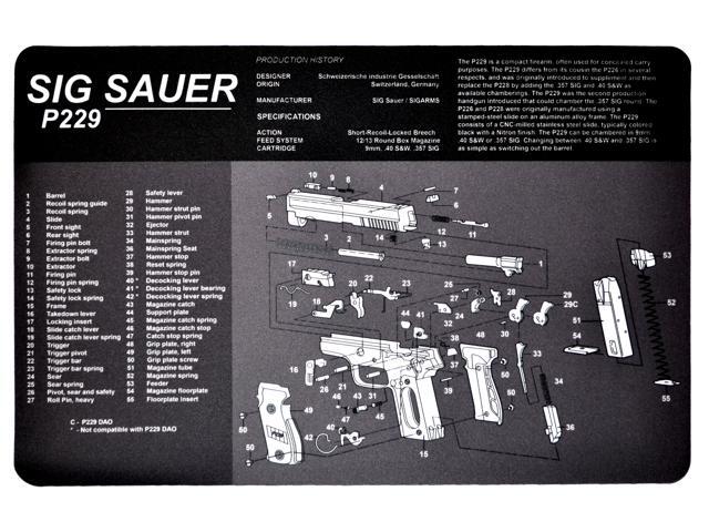 Sig Sauer P229 Handgun Protective Work Bench Cleaning Mat With Exploded Parts Diagram And